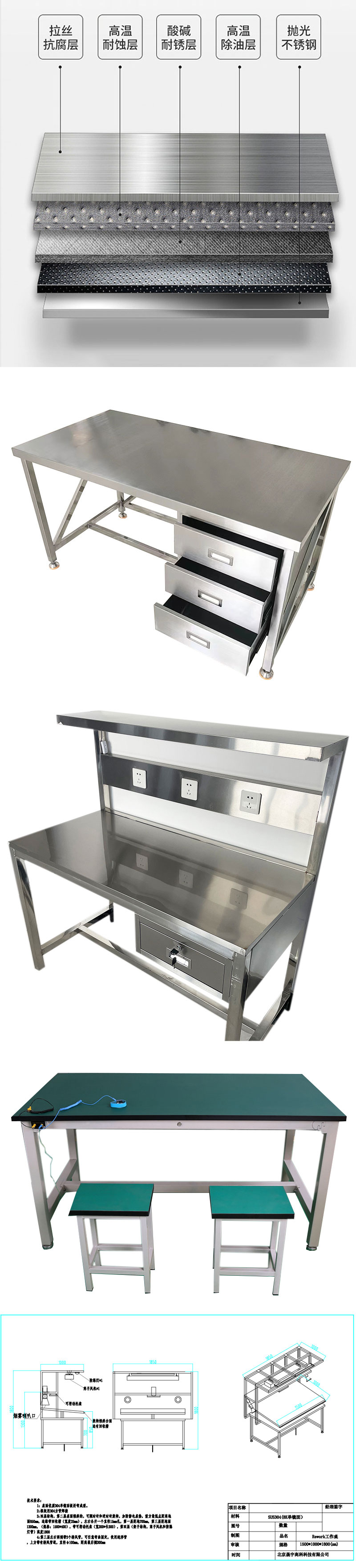 不锈钢工作台为达到防静电效果需要在桌面铺防静电台垫,台垫通过接地连入大地将工作台的静电进行释放。可根据需求增加照明、储物等功能,还可以根据需求进行特殊定制。